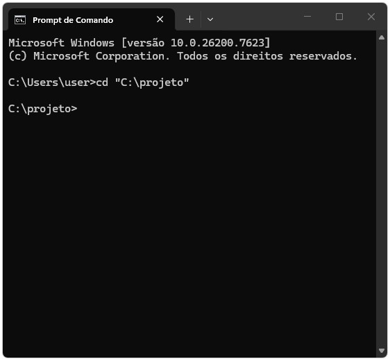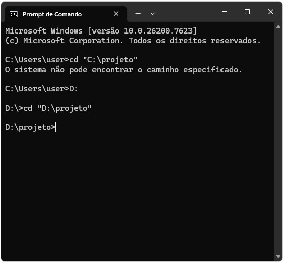 No exemplo do painel A da Figura Figura fig-terminal, cd "C:\projeto" muda o ambiente atual do diretório C:\Users\user para C:\projeto. Note, porém, que se a pasta projeto estiver em outra partição do seu armazenamento, é preciso primeiro mudar para essa partição para depois utilizar o comando cd. A Figura Figura fig-cmd ilustra esses dois casos.